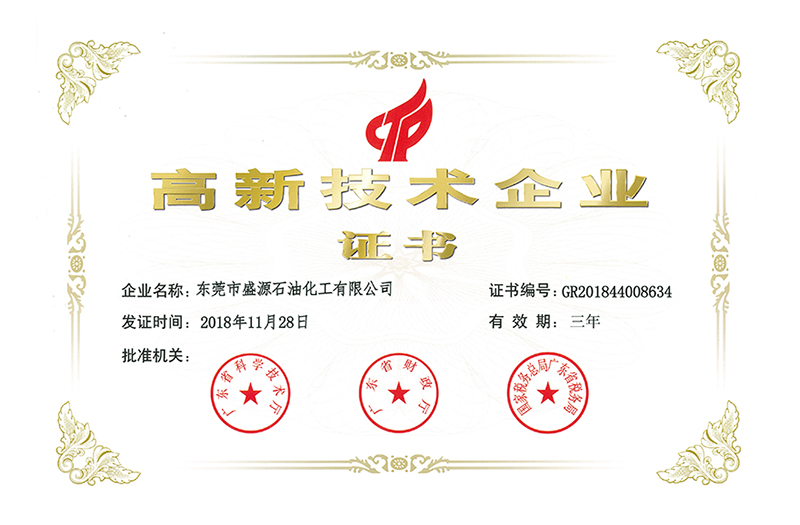 近日,15vip太阳集团所属东莞市盛源石油化工有限公司顺利通过“国家高新技术企业”认定,获得了由广东省科学技术厅、广东省财政厅、国家税务总局广东省税务局联合颁发的高新技术企业证书,证书编号为GR201844008634。